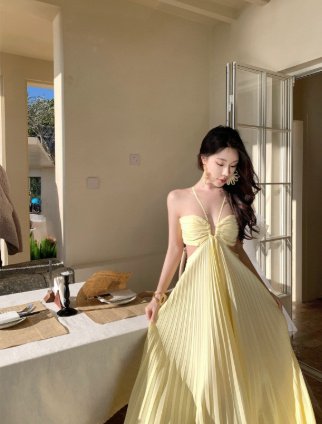 Ins Pleated Sleeveless Sling Dress Hollow High Waist Halter Robe Dresses For Evening Party Club Clothing Women