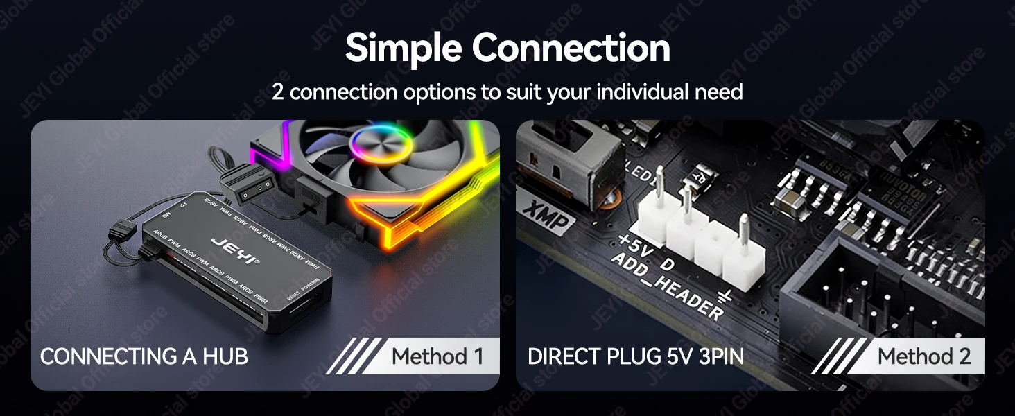 Connect via HUB or directly to motherboard 5V 3PIN header