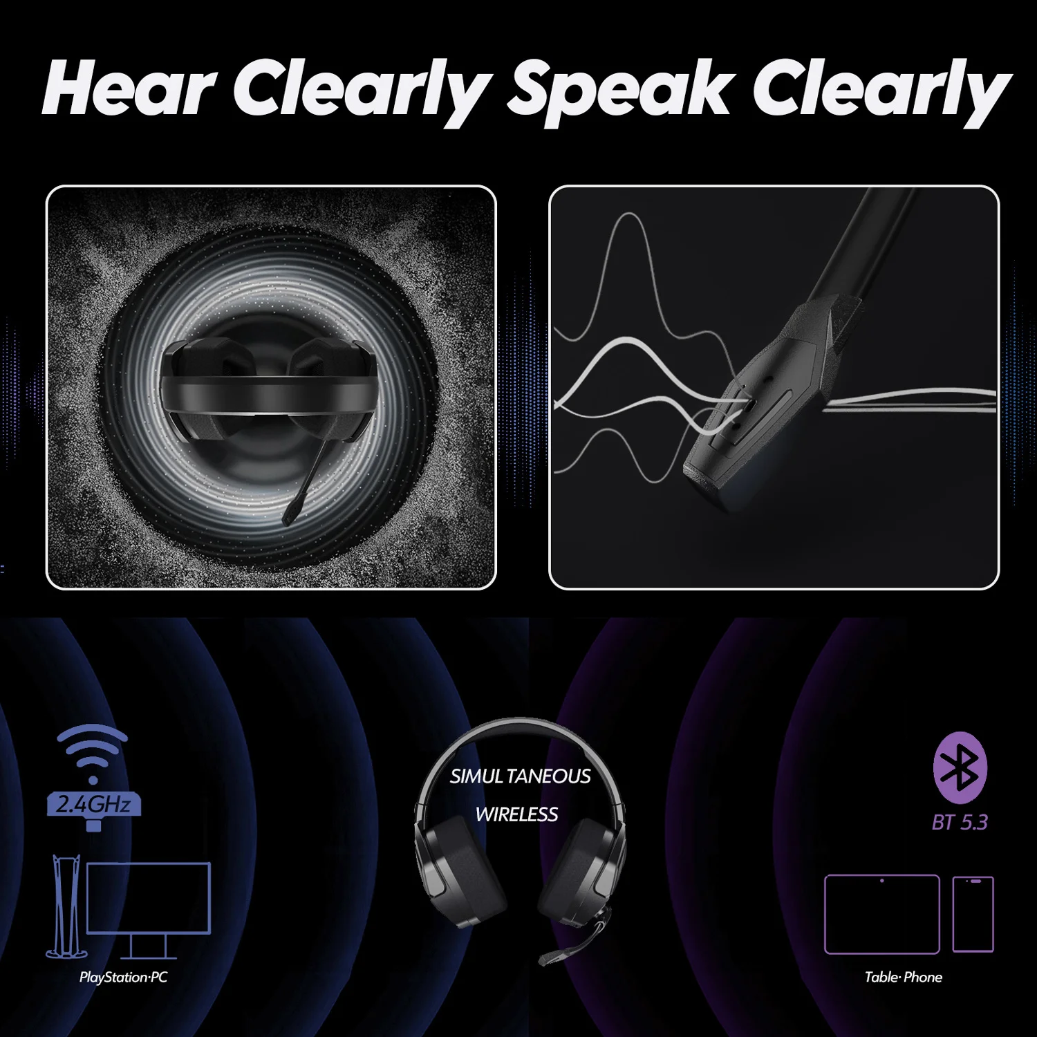 Dual Wireless Freedom: Equipped with dual wireless technology (2.4GHz + Bluetooth 5.3), the headset ensures zero-compromise multitasking. While the 2.4GHz dongle connects to gaming consoles (PS5, PS4, PC) for ultra-low-latency audio, the Bluetooth 5.3 simultaneously links to your smartphone. Miss no critical calls—even during intense gaming sessions—as a single power button press instantly answers incoming calls without disrupting gameplay
